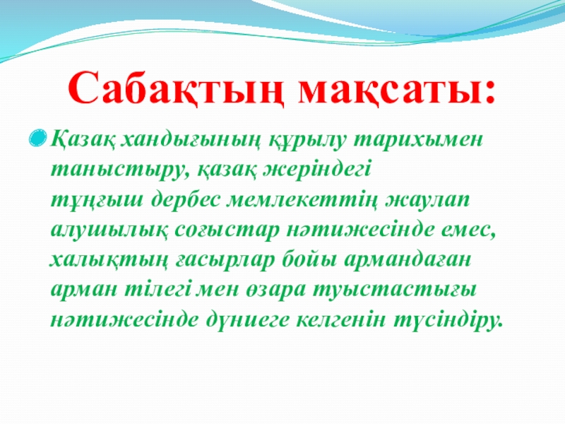 Сабақтың мақсаты:Қазақ хандығының құрылу тарихымен таныстыру, қазақ жеріндегі тұңғыш дербес мемлекеттің жаулап алушылық соғыстар нәтижесінде емес, халықтың