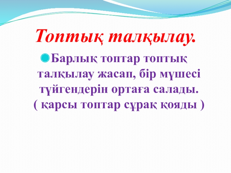 Топтық талқылау.Барлық топтар топтық талқылау жасап, бір мүшесі түйгендерін ортаға салады.