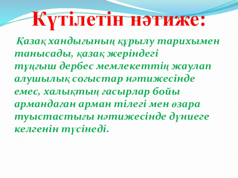 Күтілетін нәтиже: Қазақ хандығының құрылу тарихымен танысады, қазақ жеріндегі тұңғыш дербес мемлекеттің жаулап алушылық соғыстар нәтижесінде емес,
