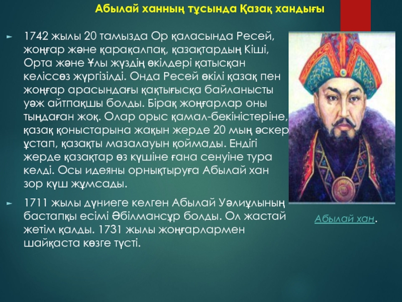 Слайд 28Жоңғарияның ханы Қалдан Серен 1745 жылы өліп, оның мұрагерлері таққа таласты.