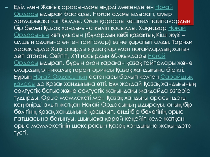 Слайд 15Еділ мен Жайық арасындағы өңірді мекендеген Ноғай Ордасы ыдырай бастады. Ноғай одағы ыдырап,