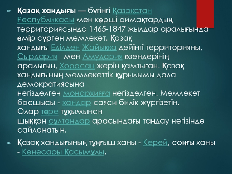 Слайд 5Қазақ хандығы — бүгінгі Қазақстан Республикасы мен көрші аймақтардың территориясында 1465-1847 жылдар аралығында өмір