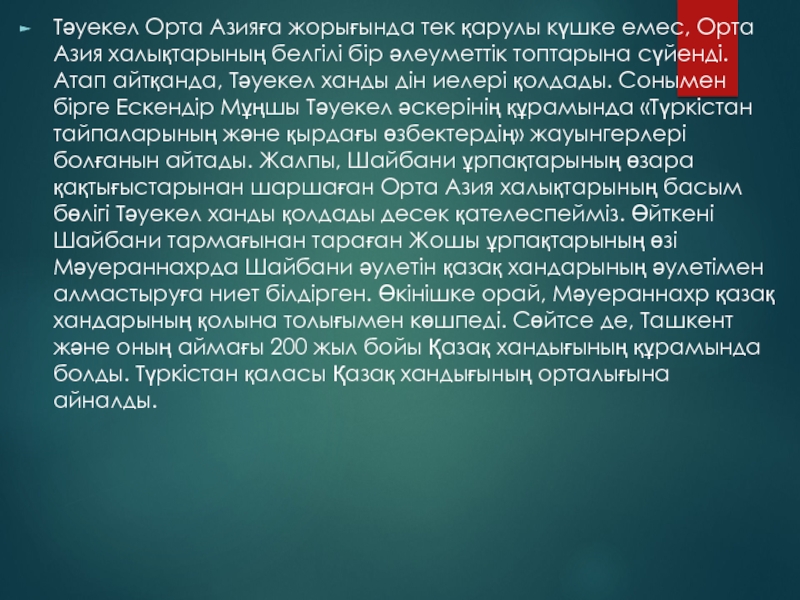 Слайд 20Тәуекел Орта Азияға жорығында тек қарулы күшке емес, Орта Азия халықтарының