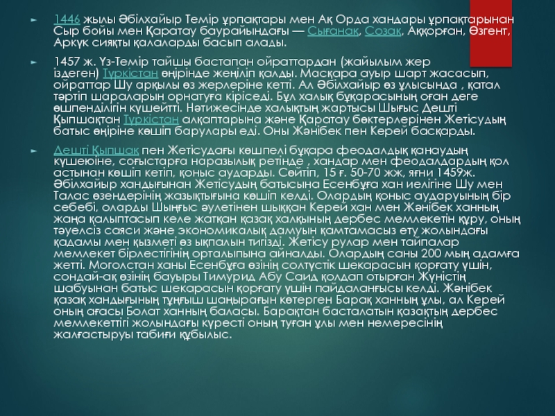 Слайд 71446 жылы Әбілхайыр Темір ұрпақтары мен Ақ Орда хандары ұрпақтарынан Сыр бойы