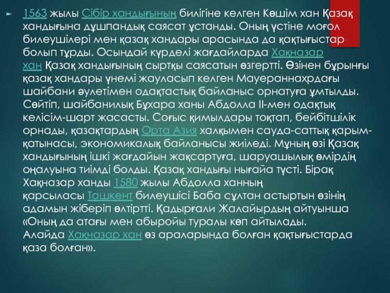 Слайд 161563 жылы Сібір хандығының билігіне келген Көшім хан Қазақ хандығына дұшпандық саясат ұстанды. Оның
