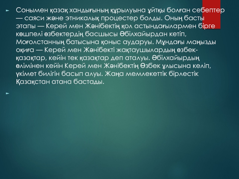 Слайд 10Сонымен қазақ хандығының құрылуына ұйтқы болған себептер — саяси және этникалық