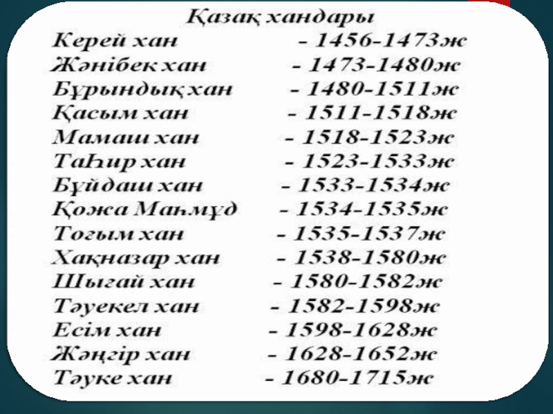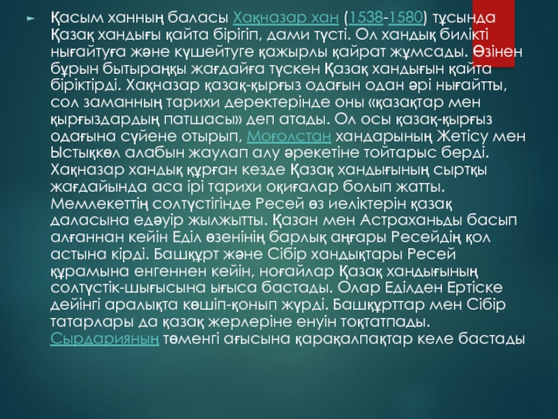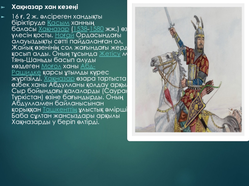 Слайд 14Қасым ханның баласы Хақназар хан (1538-1580) тұсында Қазақ хандығы қайта бірігіп, дами түсті.
