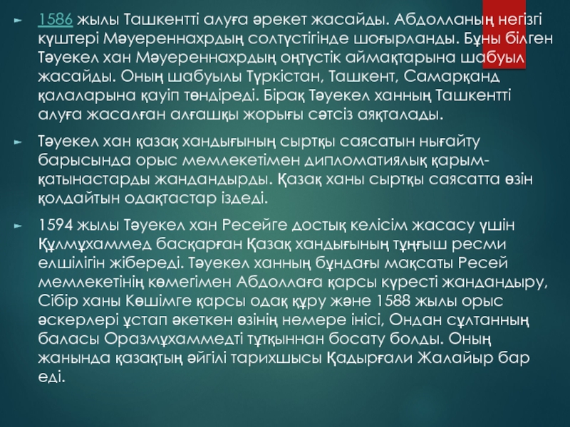 Слайд 181586 жылы Ташкентті алуға әрекет жасайды. Абдолланың негізгі күштері Мәуереннахрдың солтүстігінде шоғырланды.