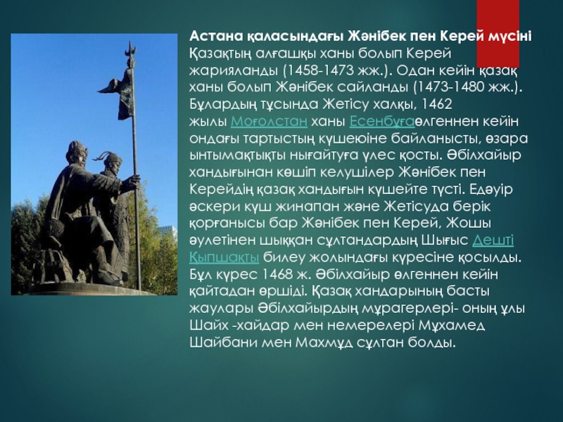 Слайд 8Астана қаласындағы Жәнібек пен Керей мүсіні
