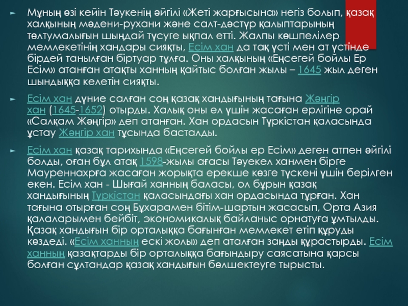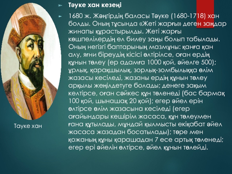 Слайд 23Мұның өзі кейін Тәукенің әйгілі «Жеті жарғысына» негіз болып, қазақ халқының
