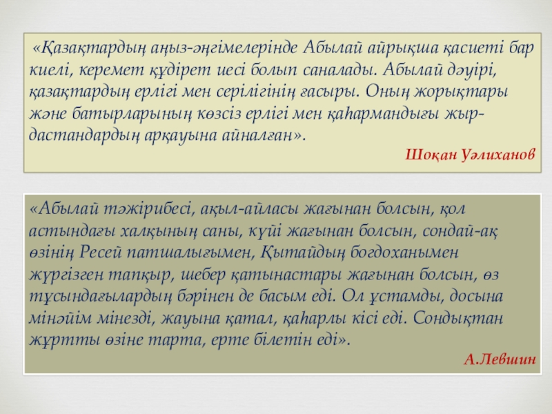 «Абылай тәжірибесі, ақыл-айласы жағынан болсын, қол астындағы халқының саны, күйі жағынан болсын, сондай-ақ өзінің Ресей патшалығымен, Қытайдың богдоханымен жүргізген тапқыр, шебер қатынастары жағынан болсын, өз тұсындағылардың бәрінен де басым еді. Ол ұстамды, досына мінәйім мінезді, жауына қатал, қаһарлы кісі еді. Сондықтан жұртты өзіне тарта, ерте білетін еді».