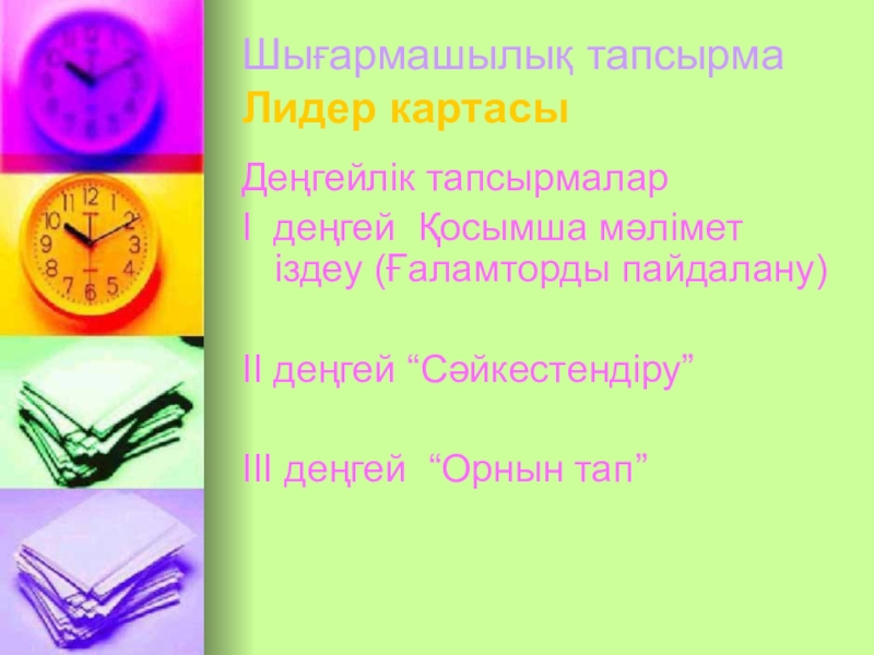 Шығармашылық тапсырма Лидер картасы Деңгейлік тапсырмаларІ деңгей Қосымша мәлімет іздеу (Ғаламторды пайдалану)ІІ деңгей “Сәйкестендіру”ІІІ деңгей “Орнын тап”