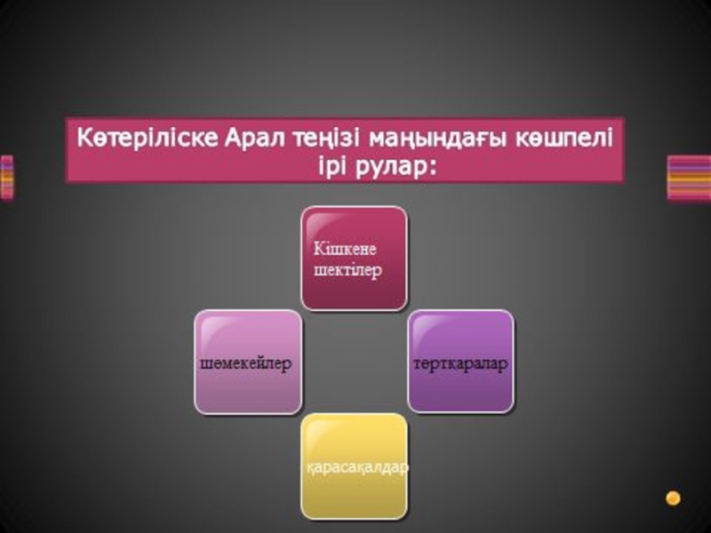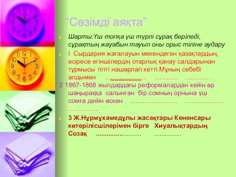 “Сөзімді аяқта”Шарты:Үш топқа үш түрлі сұрақ беріледі, сұрақтың жауабын тауып оны орыс тіліне аудару І Сырдария жағалауын