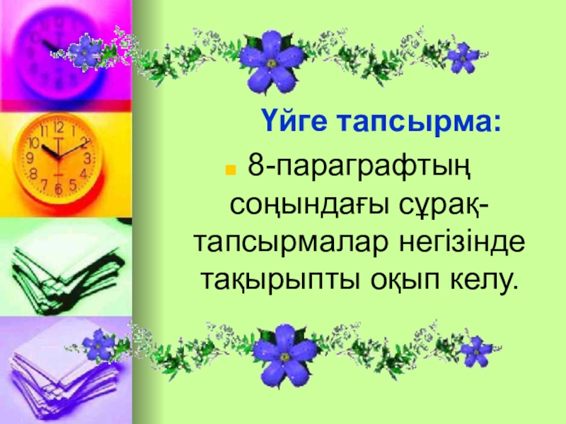 Үйге тапсырма:8-параграфтың соңындағы сұрақ-тапсырмалар негізінде тақырыпты оқып келу.