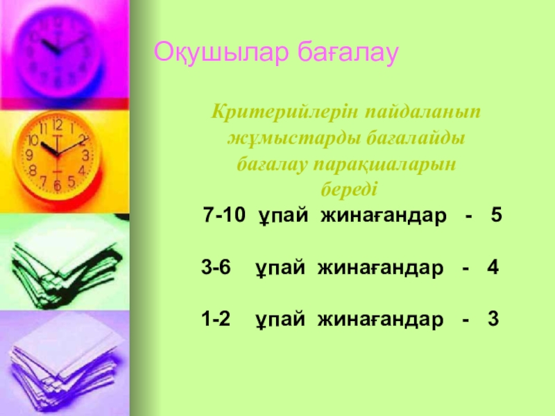 Оқушылар бағалауКритерийлерін пайдаланып жұмыстарды	бағалайдыбағалау парақшаларын береді     7-10 ұпай жинағандар  -  5