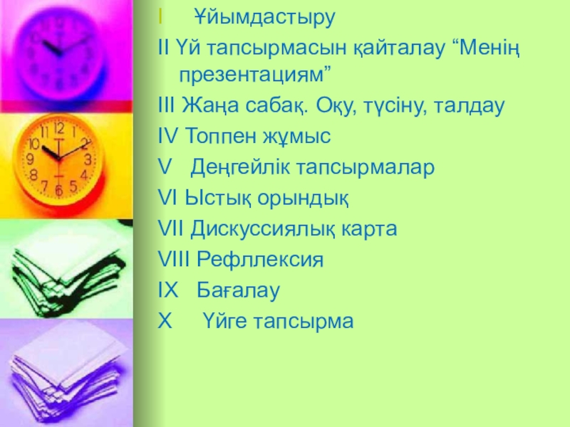 І   ҰйымдастыруІІ Үй тапсырмасын қайталау “Менің презентациям”ІІІ Жаңа сабақ. Оқу, түсіну, талдауІV Топпен жұмысV