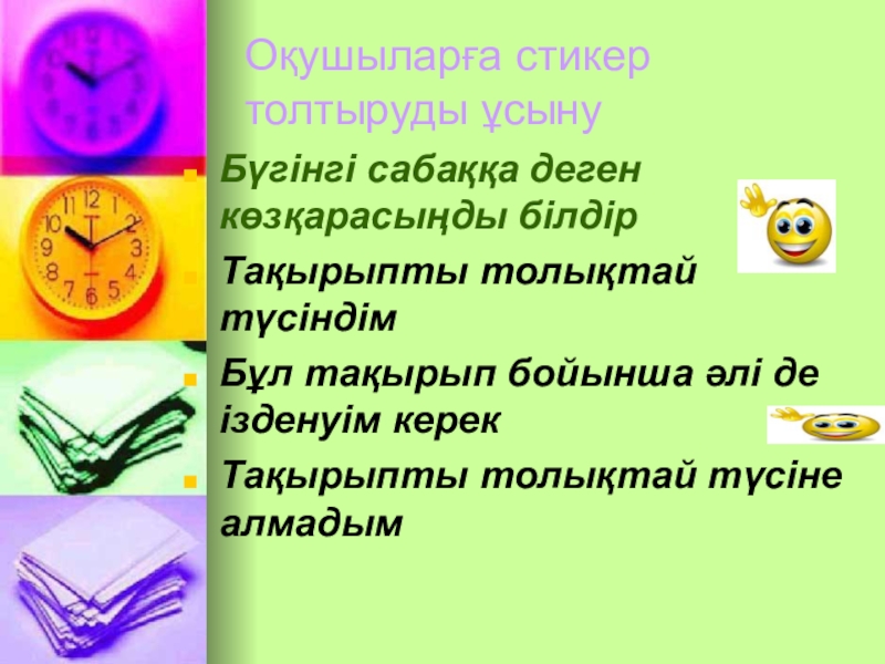 Оқушыларға стикер толтыруды ұсынуБүгінгі сабаққа деген көзқарасыңды білдірТақырыпты толықтай түсіндімБұл тақырып бойынша әлі де ізденуім керекТақырыпты толықтай