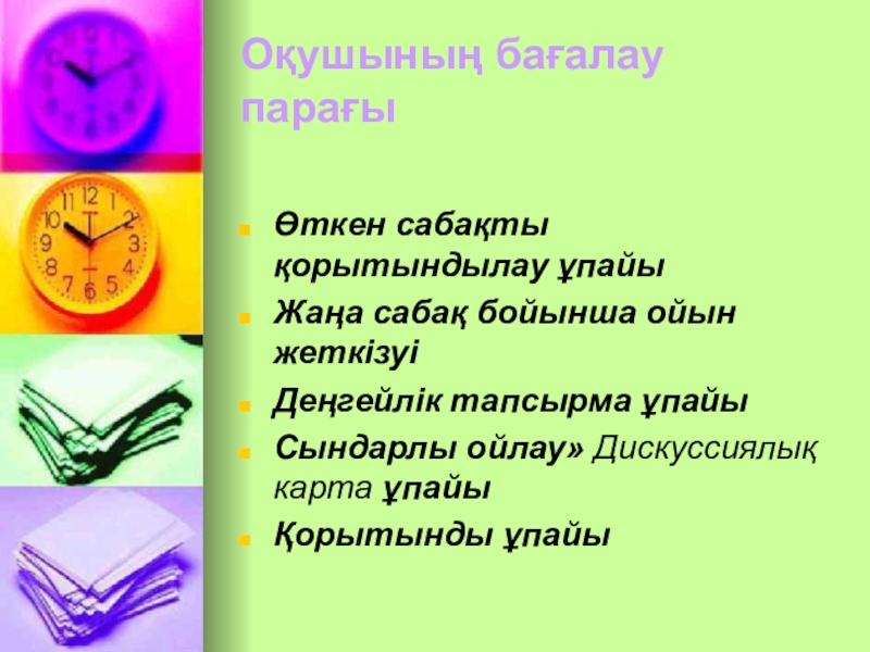 Оқушының бағалау парағыӨткен сабақты қорытындылау ұпайыЖаңа сабақ бойынша ойын жеткізуіДеңгейлік тапсырма ұпайыСындарлы ойлау» Дискуссиялық карта ұпайыҚорытынды ұпайы