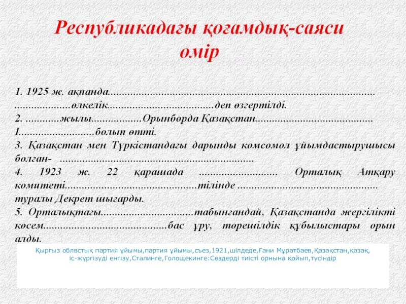іс-жүргізуді енгізу,Сталинге,Голощекинге:Сөздерді тиісті орнына қойып,түсіндір