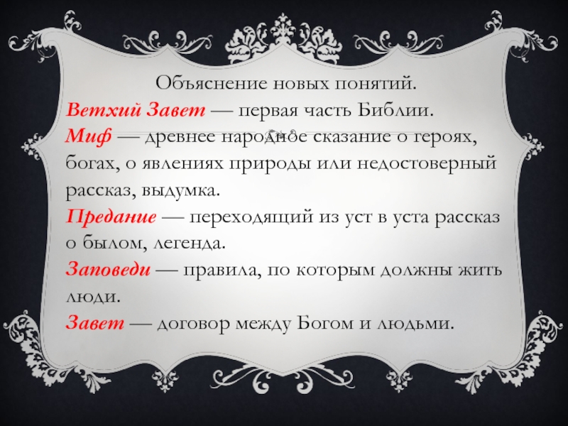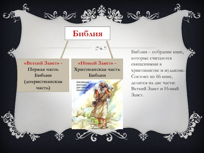 Библия – собрание книг, которые считаются священными в христианстве и иудаизме. Состоит из 66 книг, делится на две части: Ветхий Завет и Новый Завет.