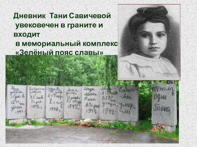 Дневник Тани Савичевой увековечен в граните и входит в мемориальный комплекс «Зелёный пояс славы»