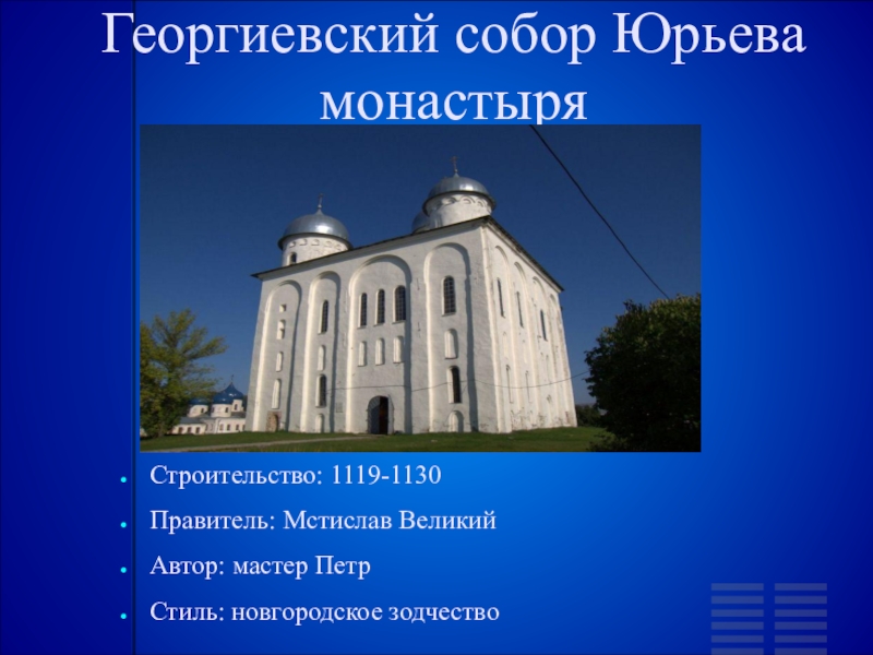 Георгиевский собор Юрьева монастыряСтроительство: 1119-1130Правитель: Мстислав ВеликийАвтор: мастер ПетрСтиль: новгородское зодчество