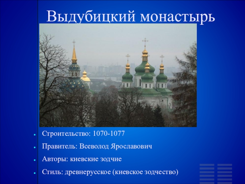 Выдубицкий монастырь Строительство: 1070-1077Правитель: Всеволод Ярославович Авторы: киевские зодчиеСтиль: древнерусское (киевское зодчество)