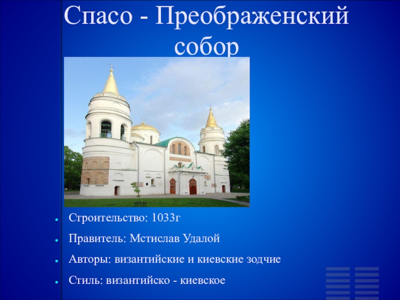 Спасо - Преображенский соборСтроительство: 1033гПравитель: Мстислав Удалой Авторы: византийские и киевские зодчие Стиль: византийско - киевское