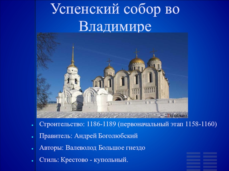 Успенский собор во ВладимиреСтроительство: 1186-1189 (первоначальный этап 1158-1160)Правитель: Андрей Боголюбский Авторы: Валеволод Большое гнездоСтиль: Крестово - купольный.