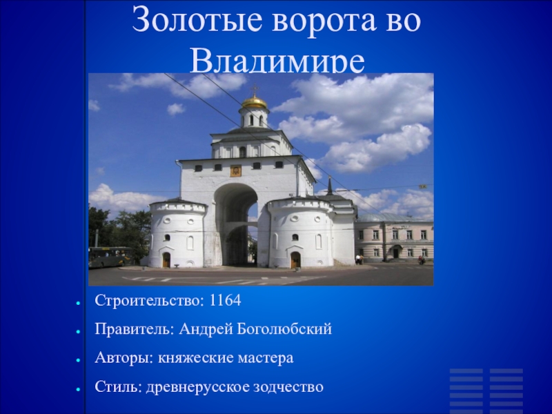 Золотые ворота во ВладимиреСтроительство: 1164Правитель: Андрей БоголюбскийАвторы: княжеские мастераСтиль: древнерусское зодчество