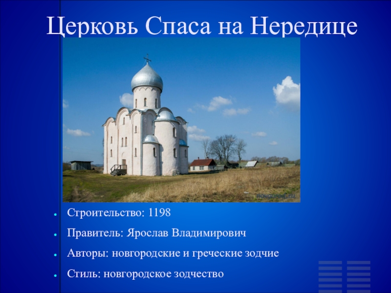 Церковь Спаса на НередицеСтроительство: 1198Правитель: Ярослав Владимирович Авторы: новгородские и греческие зодчие Стиль: новгородское зодчество