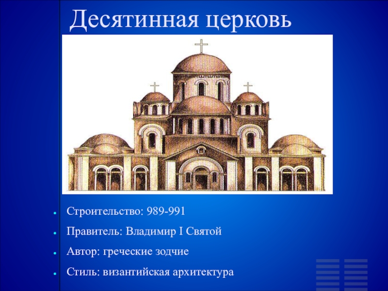 Десятинная церковь Строительство: 989-991Правитель: Владимир I СвятойАвтор: греческие зодчие Стиль: византийская архитектура