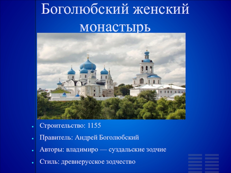Боголюбский женский монастырьСтроительство: 1155Правитель: Андрей БоголюбскийАвторы: владимиро — суздальские зодчие Стиль: древнерусское зодчество