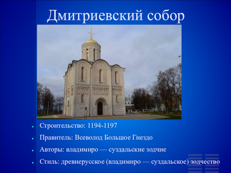 Дмитриевский собор Строительство: 1194-1197Правитель: Всеволод Большое ГнездоАвторы: владимиро — суздальские зодчиеСтиль: древнерусское (владимиро — суздальское) зодчество