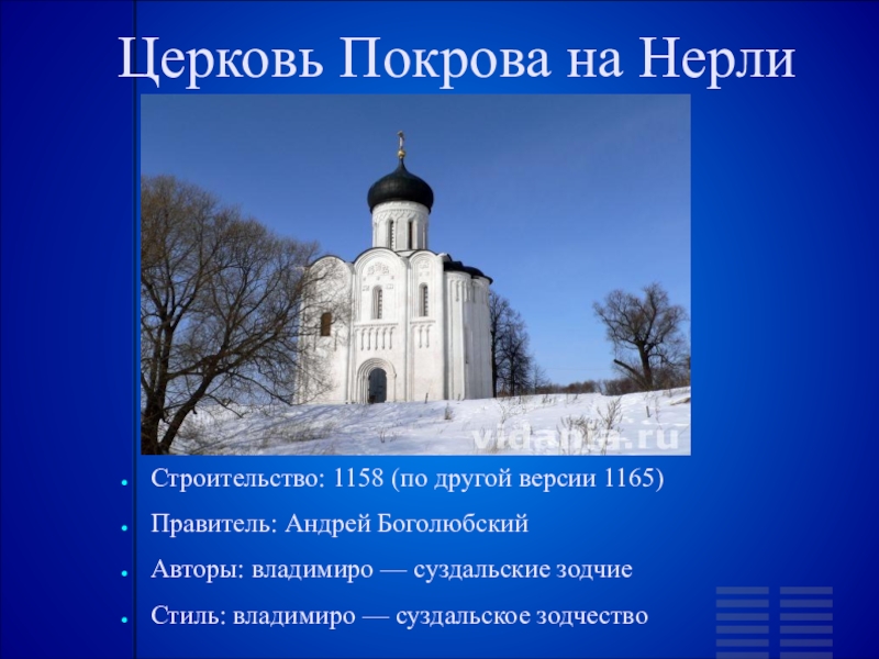 Церковь Покрова на Нерли Строительство: 1158 (по другой версии 1165)Правитель: Андрей БоголюбскийАвторы: владимиро — суздальские зодчиеСтиль: владимиро