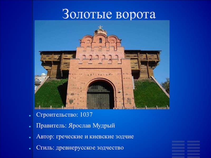 Золотые воротаСтроительство: 1037Правитель: Ярослав Мудрый Автор: греческие и киевские зодчие Стиль: древнерусское зодчество