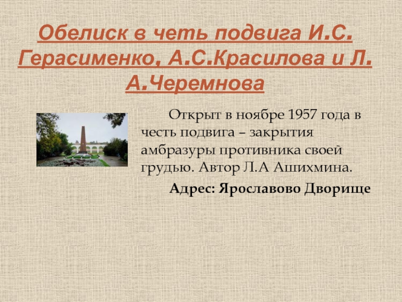 Обелиск в четь подвига И.С.Герасименко, А.С.Красилова и Л.А.Черемнова