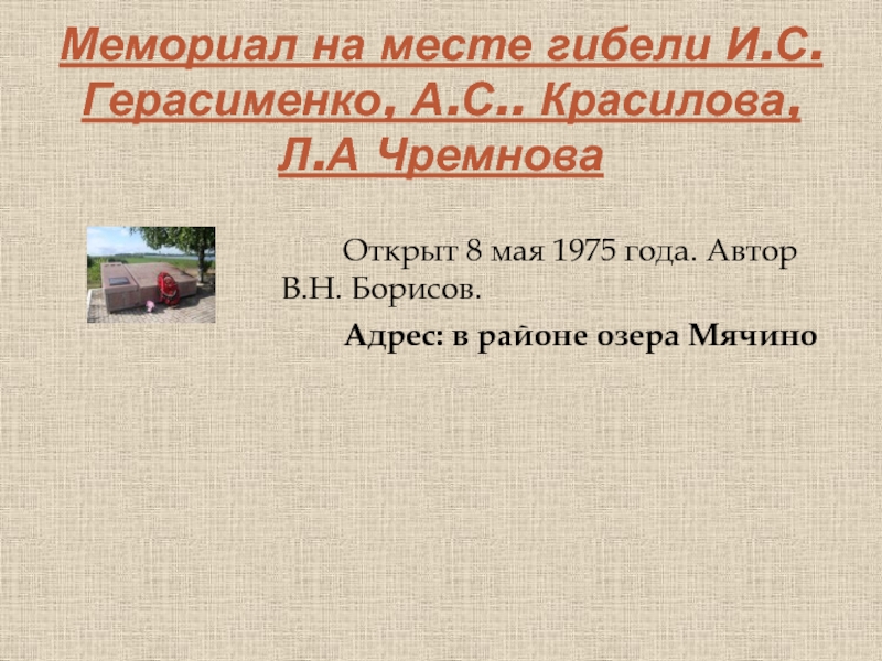 Мемориал на месте гибели И.С. Герасименко, А.С.. Красилова, Л.А Чремнова