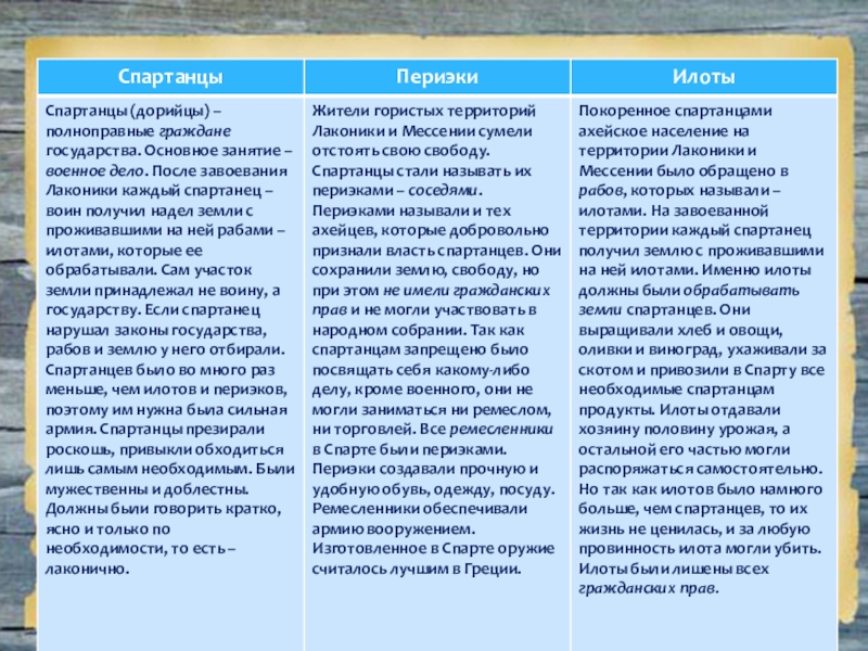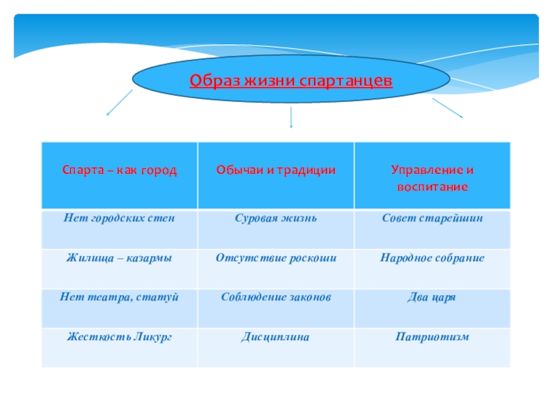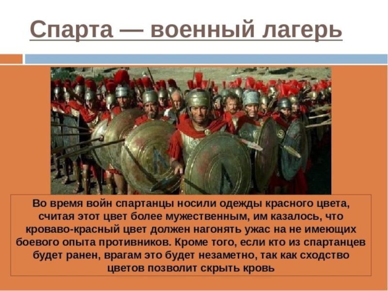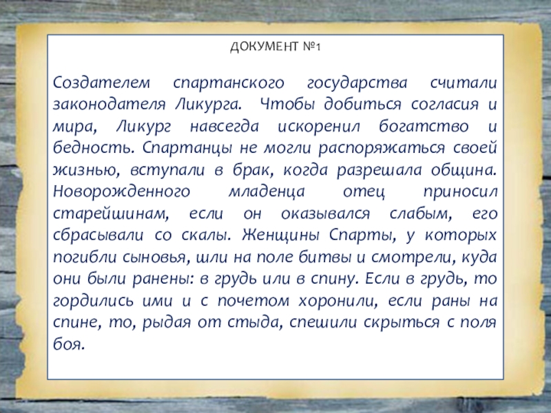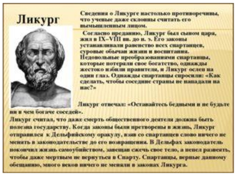 мира, Ликург навсегда искоренил богатство и бедность. Спартанцы не могли распоряжаться своей жизнью, вступали в брак, когда разрешала община. Новорожденного младенца отец приносил старейшинам, если он оказывался слабым, его сбрасывали со скалы. Женщины Спарты, у которых погибли сыновья, шли на поле битвы и смотрели, куда они были ранены: в грудь или в спину. Если в грудь, то гордились ими и с почетом хоронили, если раны на спине, то, рыдая от стыда, спешили скрыться с поля боя.
