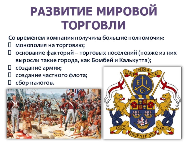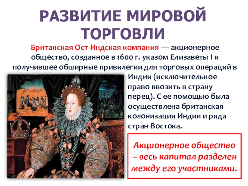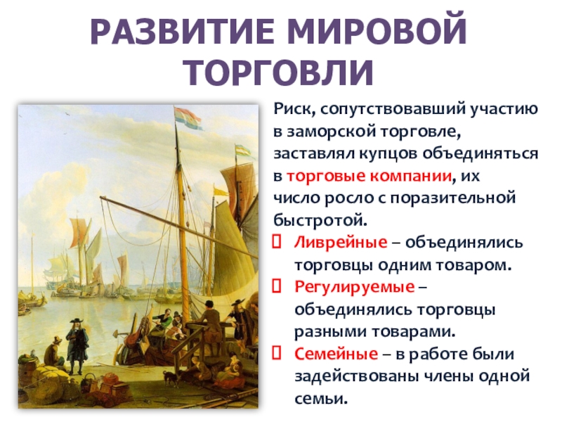 Голландская Ост-Индская компания (1602 — 1798 гг.) торговала чаем, медью, серебром, текстилем, хлопком, шёлком, керамикой, пряностями и опиумом) с Японией, Китаем, Цейлоном, Индонезией.