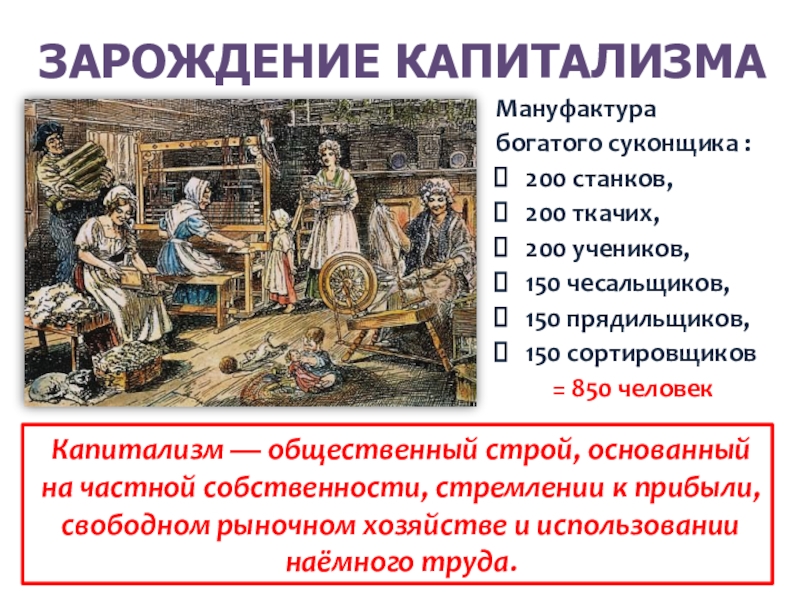 Капитализм — общественный строй, основанный на частной собственности, стремлении к прибыли, свободном рыночном хозяйстве и использовании наёмного труда.