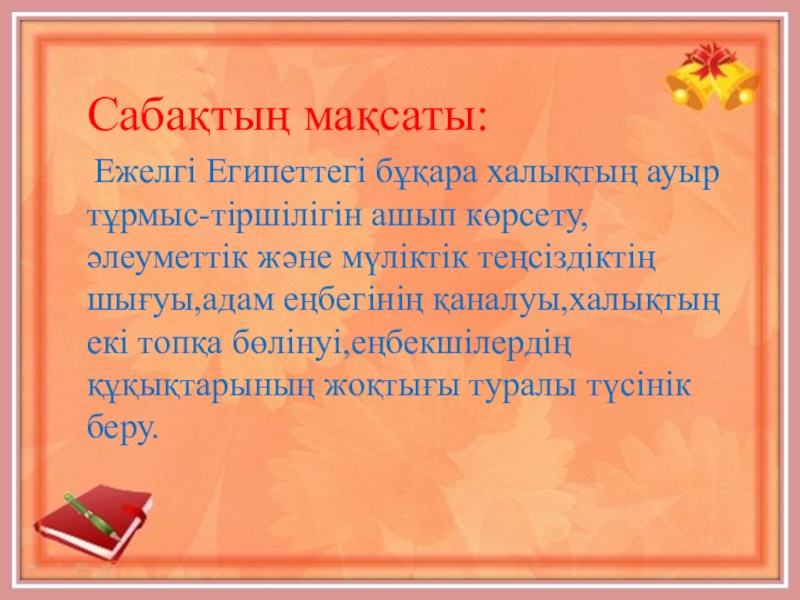 Сабақтың мақсаты: Ежелгі Египеттегі бұқара халықтың ауыр тұрмыс-тіршілігін ашып көрсету,әлеуметтік және мүліктік теңсіздіктің шығуы,адам еңбегінің қаналуы,халықтың екі топқа бөлінуі,еңбекшілердің құқықтарының жоқтығы туралы түсінік беру.