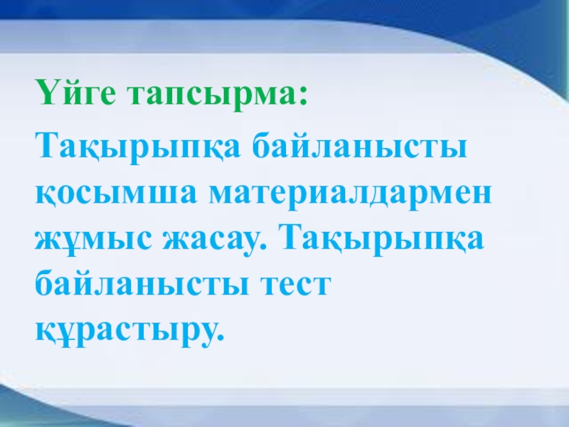 Үйге тапсырма:Тақырыпқа байланысты қосымша материалдармен жұмыс жасау. Тақырыпқа байланысты тест құрастыру.