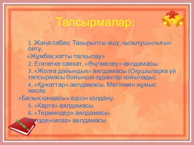 Тапсырмалар:1. Жаңа сабақ: Тақырыпты ашу, қызығушылығын ояту.   «Жұмбақ