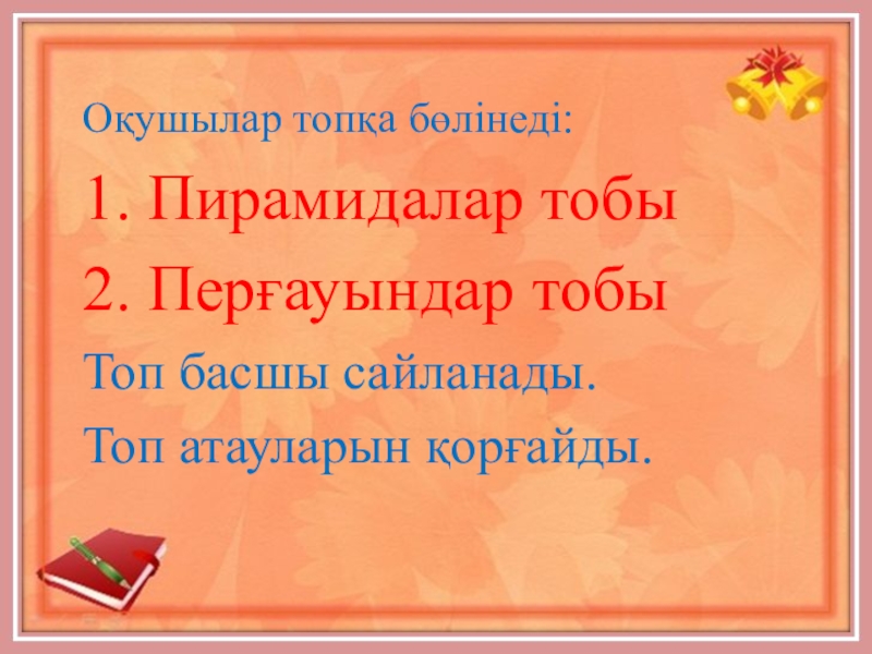 Оқушылар топқа бөлінеді:1. Пирамидалар тобы2. Перғауындар тобы Топ басшы сайланады. Топ атауларын қорғайды.