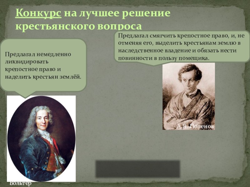 Предлагал смягчить крепостное право, и, не отменяя его, выделить крестьянам землю в наследственное владение и обязать нести повинности в пользу помещика.