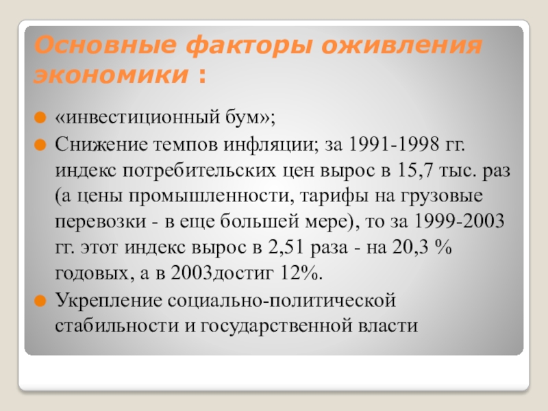 Слайд 13Основные факторы оживления экономики :