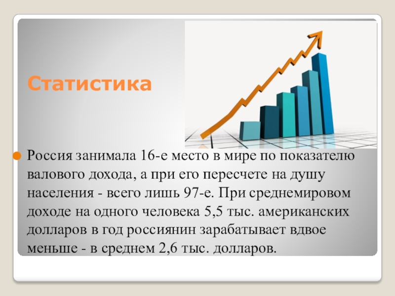при его пересчете на душу населения - всего лишь 97-е. При среднемировом доходе на одного человека 5,5 тыс. американских долларов в год россиянин зарабатывает вдвое меньше - в среднем 2,6 тыс. долларов.