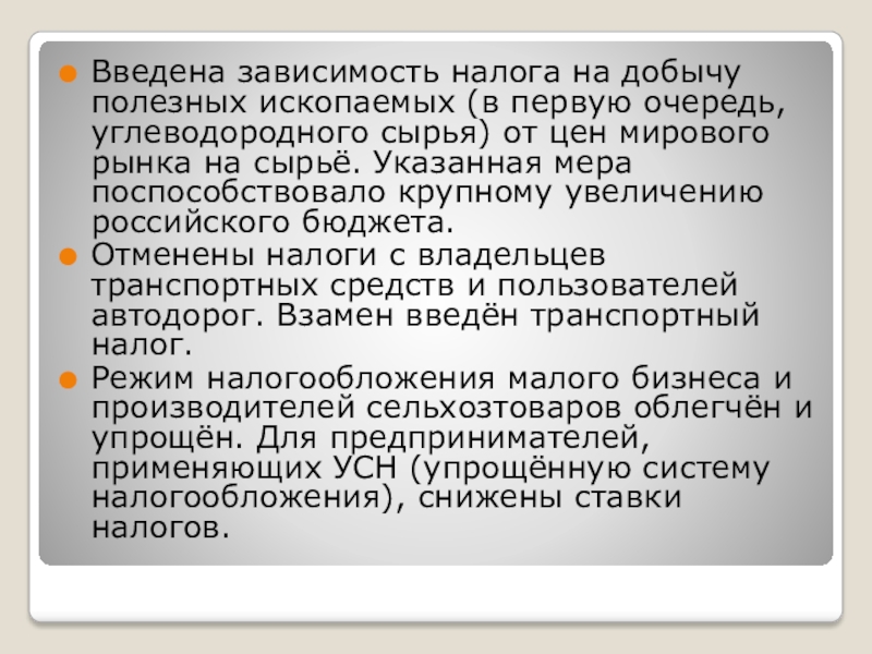 Слайд 6Введена зависимость налога на добычу полезных ископаемых (в первую очередь, углеводородного