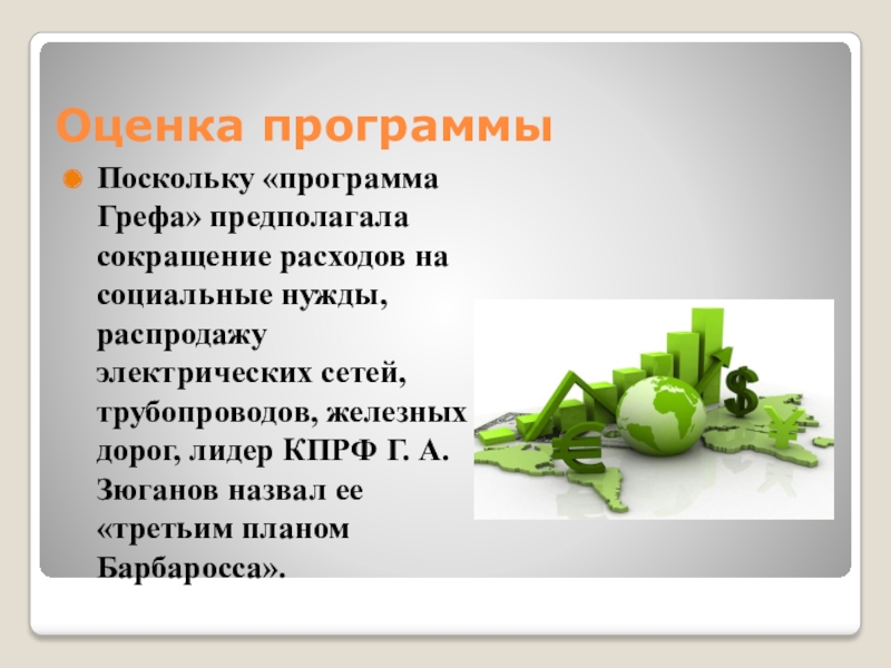 Поскольку «программа Грефа» предполагала сокращение расходов на социальные нужды, распродажу